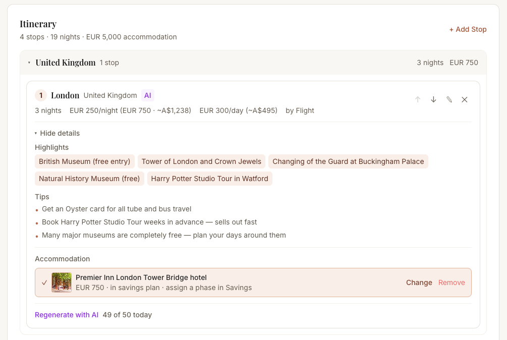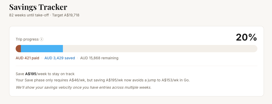Add your stops, accommodation, and bookings, and your total trip cost builds automatically with AI-powered estimates for flights, hotels, and activities. Your savings target splits into three phases (Save, Book, Go) with a weekly amount that recalculates whenever your plans change. Log your savings balance, track your velocity, and see whether you're ahead, on track, or behind — all in one place.